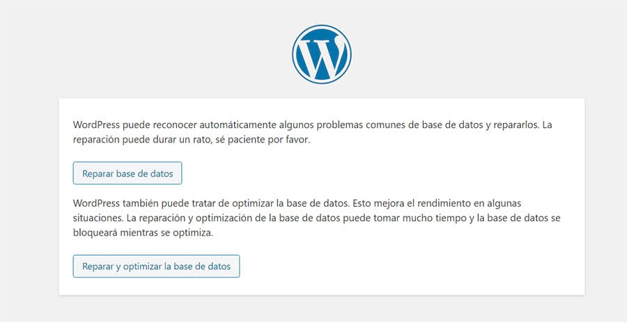 Tras guardar el archivo y cargarlo en tu servidor, puedes ejecutar el nuevo script, yendo a https://urldetusitio.com/wp-admin/maint/repair.php en tu navegador. La página lucirá así:
