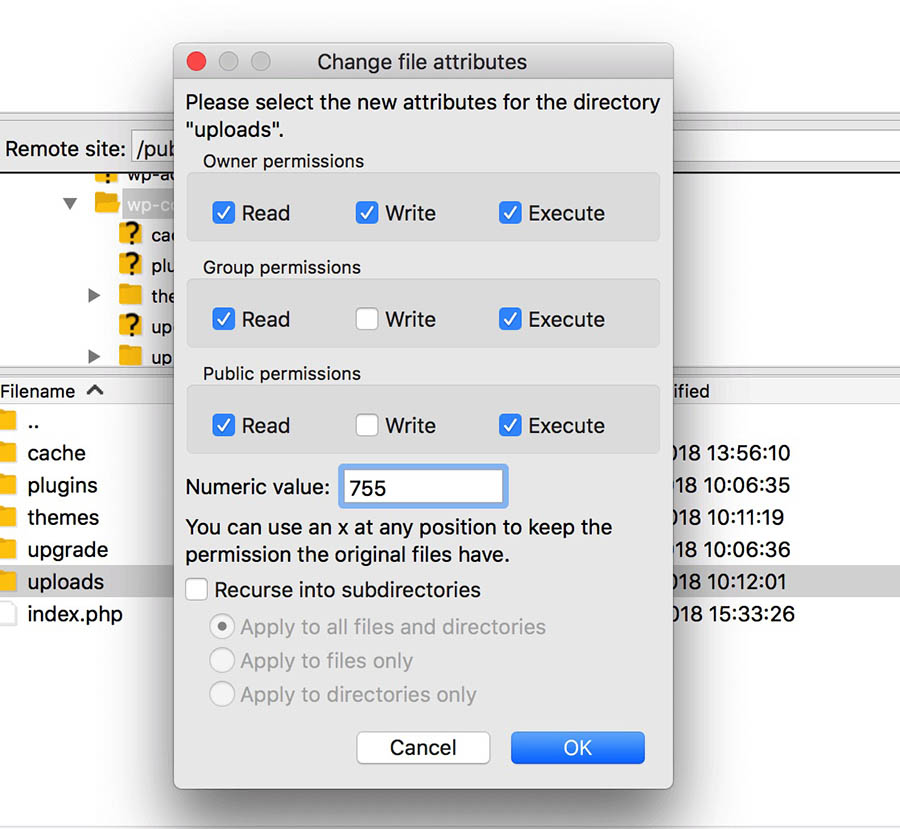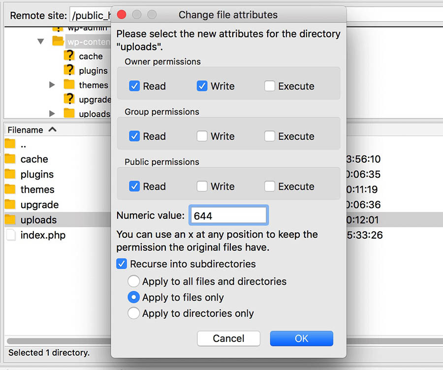 Tendrás que repetir el proceso para cada archivo de la carpeta. Haz clic derecho en ‘uploads’ y selecciona ‘File permissions’. Establece el valor en 644 y marca ‘Recurse into subdirectories’. Elige ‘Apply to files only’.
