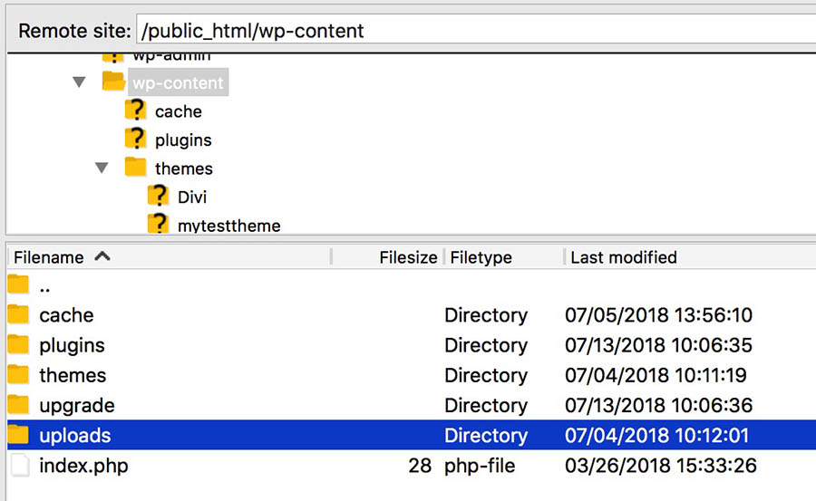 Una vez más ingresa a tu sitio con SFTP. Esta vez, querrás encontrar la carpeta ‘uploads’, ubicada en el directorio ‘wp-content’.