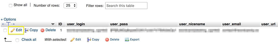 Aquí, tendrás que buscar tu tabla de usuario; suele llamarse ‘wp_users’. A continuación, busca tu usuario y haz clic en ‘Editar’.