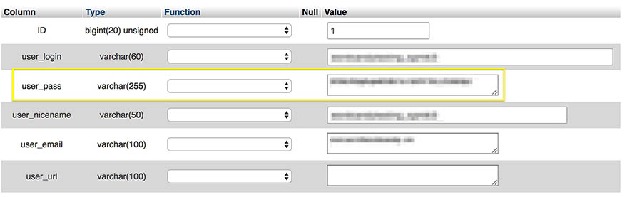 Ahora, podrás cambiar la información de tu perfil, incluyendo tu contraseña. Reemplaza la línea resaltada de caracteres, en el campo user_pass, por cualquier contraseña que desees usar.