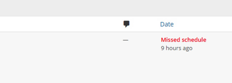 Sin embargo, este sistema a veces falla. En esos casos, verás un error de programación perdida (Missed schedule) junto a la publicación que no se publicó a tiempo.