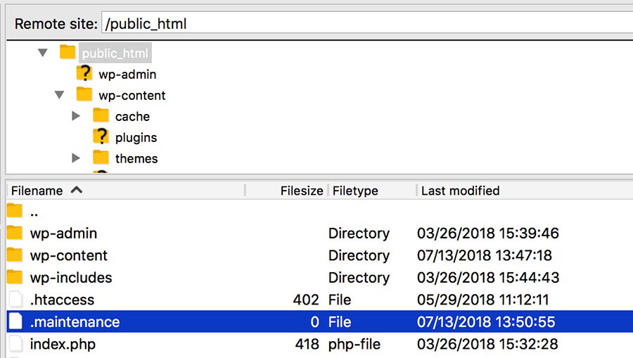 Las buenas noticias son que este es un problema bastante sencillo de solucionar. Inicia sesión en tu SFTP o cPanel, ve al directorio root y elimina el archivo .maintenance.