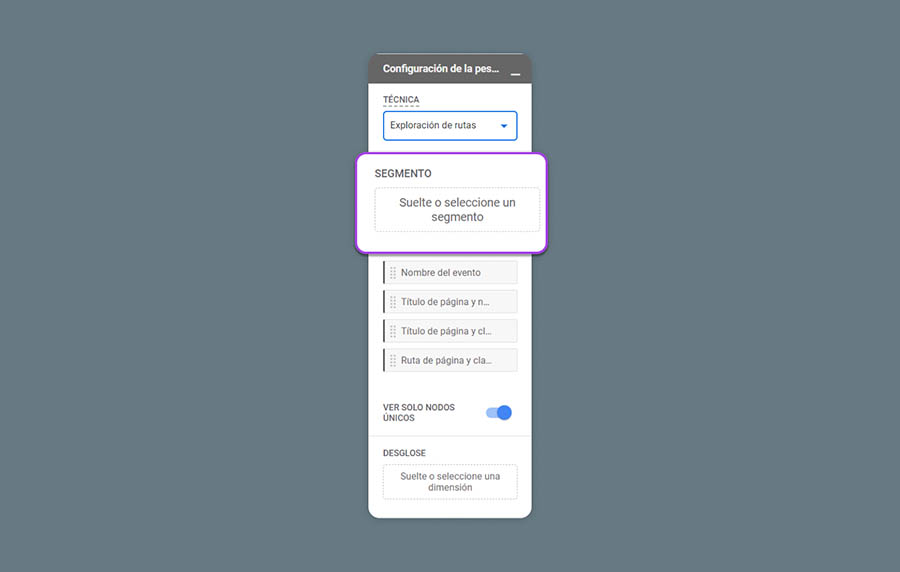 Por ejemplo, si usas un informe libre, configurarás filas y columnas de tu gráfico de exploración, con las dimensiones que selecciones. Con la técnica de ruta, configurarás nodos en su lugar (puntos de datos durante la ruta). Y con la de embudo, sus ajustes incluirán elegir la próxima acción, entre sus dimensiones.