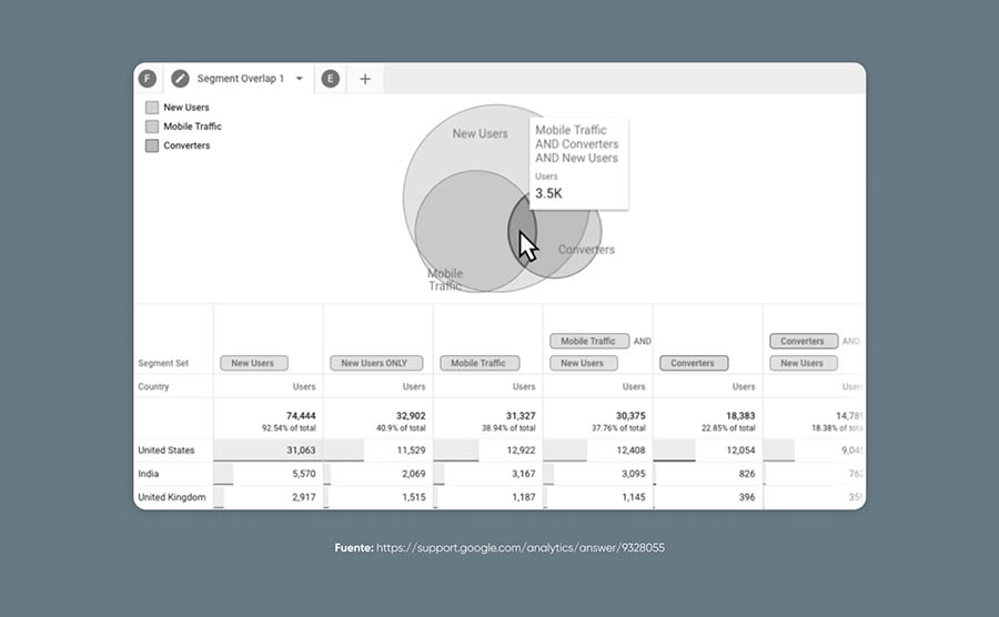 Este ejemplo de Google muestra cómo podría verse una Superposición de Segmentos, para notar dónde convergen los segmentos de nuevos usuarios, tráfico móvil y convertidores.