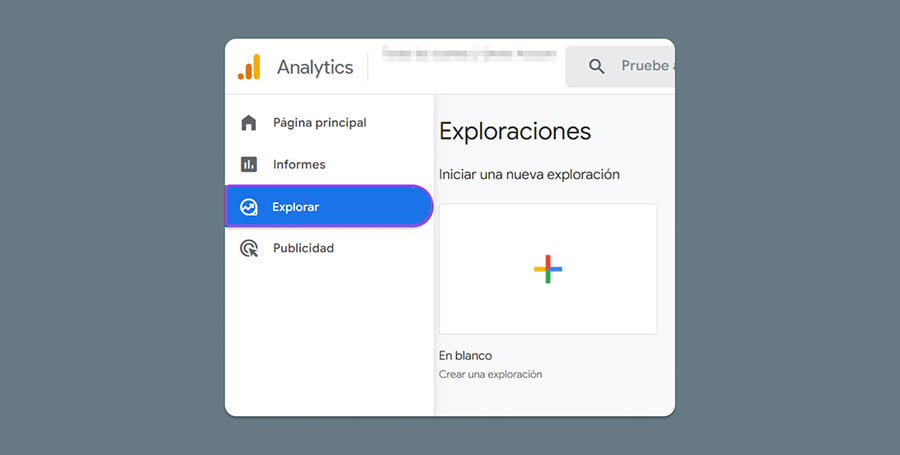 Una vez inicies sesión en la última instancia de Google Analytics, elige la cuenta y la propiedad o aplicación en que quieres una Exploración. Verás la pestaña ‘Explorar’, en el menú desplegable de la esquina superior izquierda de la pantalla, junto al logotipo de Analytics (en el escritorio). Selecciónalo, ¡y listo!