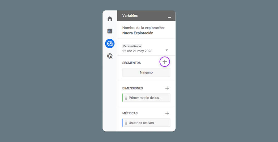 - Todavía en ‘Variables’, haz clic en ‘+’ y añade segmentos, dimensiones y métricas que definen la información que quieres mirar a fondo, en tu exploración.