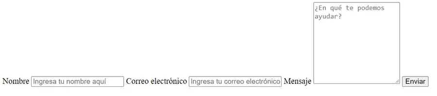 <div class="container"> <form action="mailto:tucorreo@email.com" method="POST" enctype="multipart/form-data" name="Formulario"> <label for="pnombre">Nombre</label> <input type="text" id="pnombre" name="nombre" placeholder="Ingresa tu nombre aquí"> <label for="pcorreo">Correo electrónico</label> <input type="text" id="pcorreo" name="correo" placeholder="Ingresa tu correo electrónico aquí"> <label for="mensaje">Mensaje</label> <textarea id="mensaje" name="mensaje" placeholder="¿En qué te podemos ayudar?" style="height:200px"></textarea> <input type="submit" value="Enviar"> </form> </div>