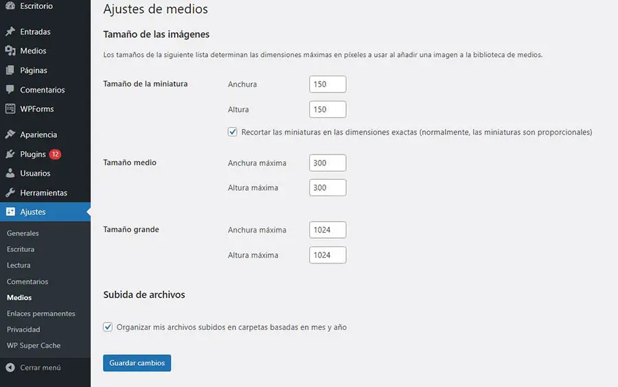 Si quieres mantener el tamaño original de tu imagen destacada, tendrás que seleccionar la opción “Full Size”. Puedes encontrar estas opciones de tamaño en tu panel de WordPress, yendo a Ajustes > Medios.