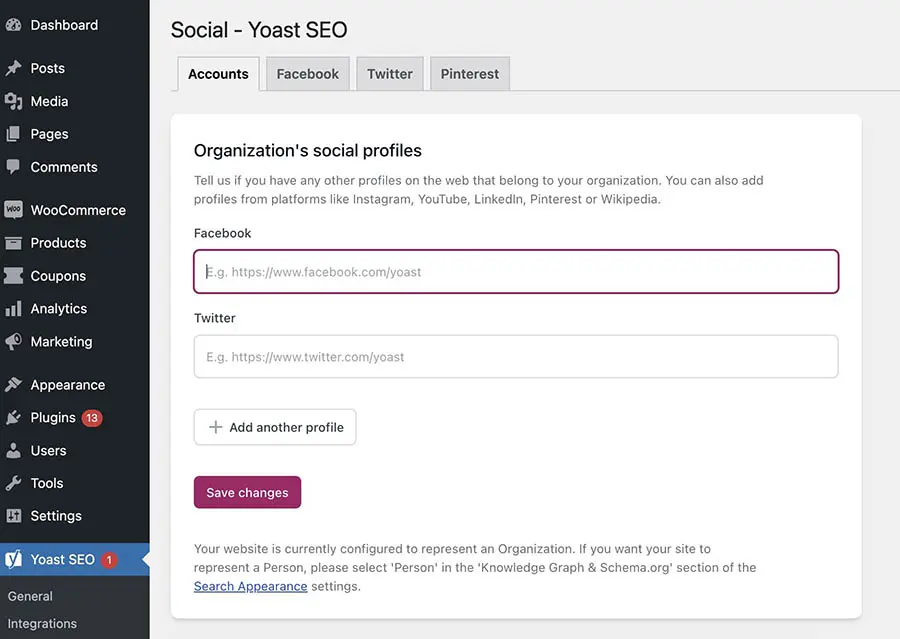 Ve a Yoast SEO > Ajustes > Representación del sitio para añadir tus perfiles de redes sociales.