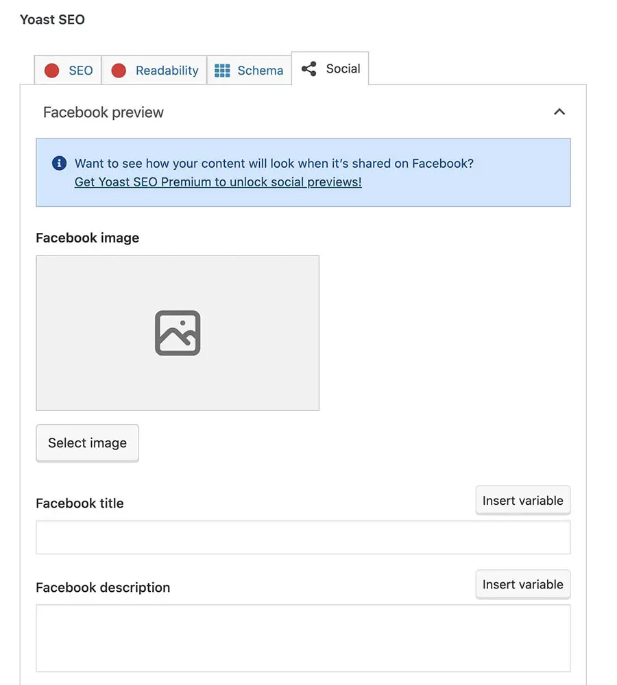 Abre la pestaña Social para personalizar las vistas previas en redes sociales, incluidos los títulos y las meta descripciones.