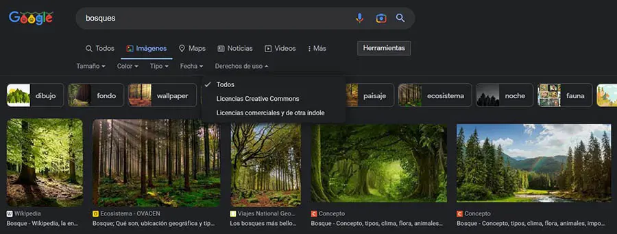 Para encontrar imágenes con licencia Creative Commons, ve a Google Imágenes y haz clic en Herramientas > Derechos de uso > Licencias Creative Commons. Una vez filtres la búsqueda, tendrás a tu disposición una gran variedad de imágenes gratuitas para elegir.