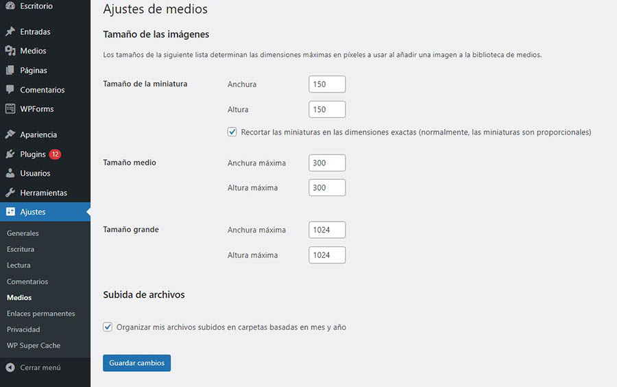 Aquí puedes actualizar el ancho y la altura con nuevos valores. Una vez guardes los cambios, las imágenes que subas se ajustarán a esas dimensiones.