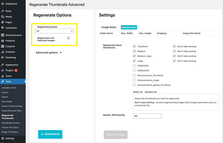 Nuestro plugin de confianza para esto es Force Regenerate Thumbnails. Después de instalarlo y activarlo, ve a Herramientas > Force Regenerate Thumbnails y haz clic en el gran botón azul Regenerate All Thumbnails.