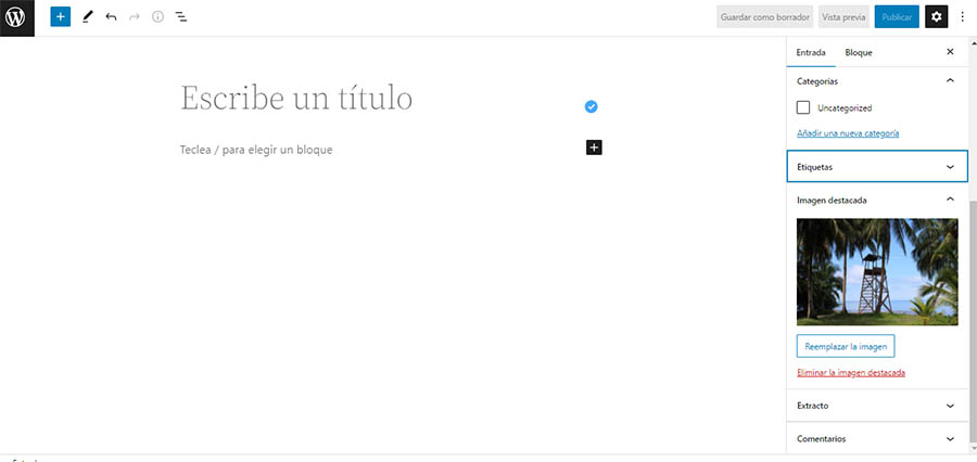 Primero, crea una nueva entrada. Haz clic en la pestaña Entrada de la barra lateral derecha y luego en Imagen destacada.