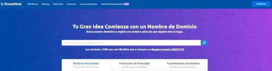 Después de registrarte, deberás elegir y registrar tu nombre de dominio. Te recomendamos usar tu nombre completo seguido de .com, si está disponible. Puedes verificar la disponibilidad con nuestra herramienta de búsqueda de dominios.