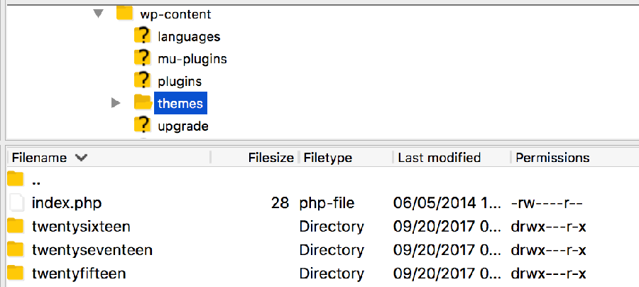 Una vez tienes el programa funcionando, accede a tu sitio con tus credenciales de FTP proporcionadas por tu compañía de alojamiento. Entonces, necesitarás navegar a la carpeta wp-content/themes/. Aquí es donde están instalados los temas de tu sitio.