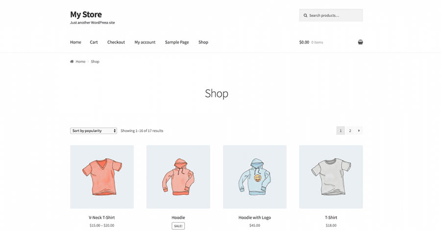 Afortunadamente, el tema Storefront es una excelente opción. Este es el tema oficial de WooCommerce; construido específicamente para ser integrado con el plugin. Se verá atractivo desde el inicio, con un diseño limpio y simple que pondrá el foco directamente en tus productos: