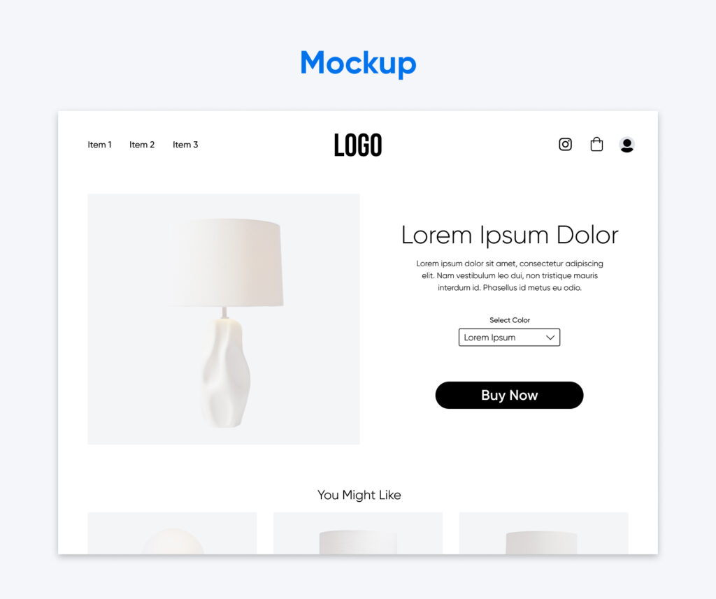 Los mockups aplican decisiones de diseño específicas a tu wireframe. Por lo general, incluyen colores, tipografías e imágenes para acercarse más al diseño final. O bien utilizan espacios reservados (placeholders) para cosas como imágenes y texto (por ejemplo, “Lorem ipsum”).