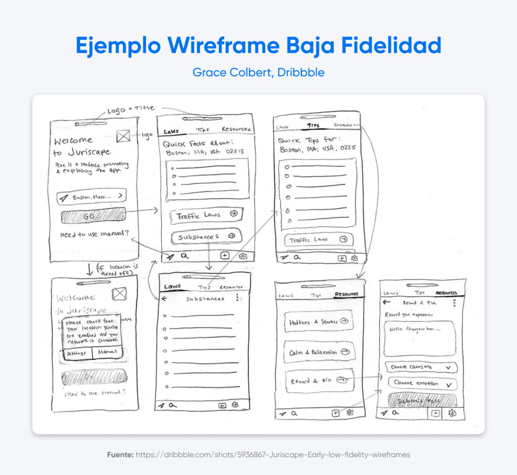 Los wireframes de baja fidelidad pueden ser tan simples como un boceto hecho a mano en una servilleta, ilustrando la estructura básica y la arquitectura de la información de una página o producto.