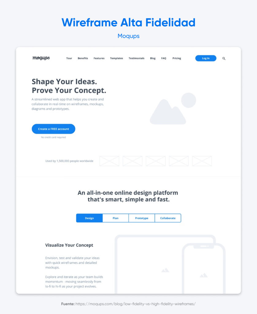Aunque sigue siendo limpio y realizable, este ejemplo de Moqups va más allá de un wireframe estándar de alta fidelidad. Incluye no solo estructura y distribución, sino también elementos de marca como color, tipografía e imágenes sutiles. En este punto, la línea entre wireframe y mockup empieza a desdibujarse.