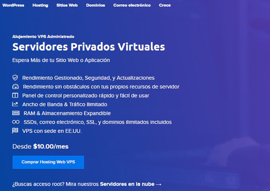 El alojamiento VPS viene con algunos beneficios de gran tamaño. Obtienes tu propio conjunto de recursos que nadie más puede usar y puedes personalizar tu configuración para que se ajuste a las necesidades únicas de tu sitio. El alojamiento VPS te provee con más recursos que el Shared Hosting y con un rendimiento más confiable. También es bastante escalable, lo que quiere decir que a medida que tu sitio crece, tú puedes simplemente actualizar el tamaño de tu servidor virtual para igualar la RAM y recursos que necesitas.