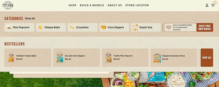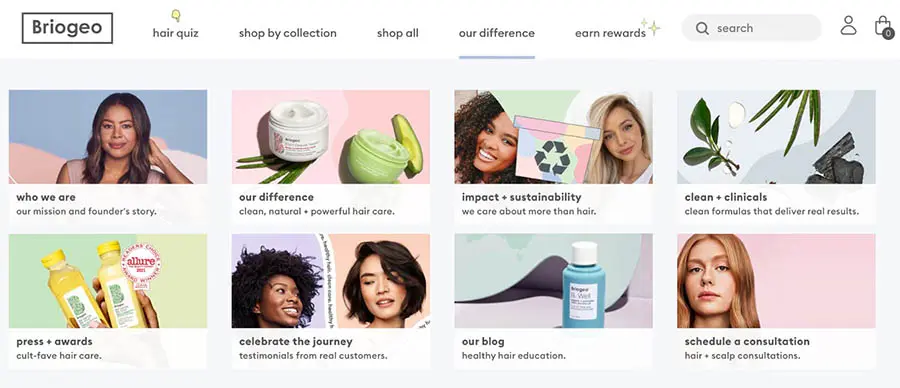 Es fácil de ver inmediatamente y está dispuesto en el orden en el que desean que los clientes interactúen. Solo un elemento en el menú, “Shop” (Comprar), tiene un menú desplegable para profundizar en el sitio. Esto es una llamada a la acción que inmediatamente dirige a los visitantes a las páginas de productos donde pueden completar sus compras.