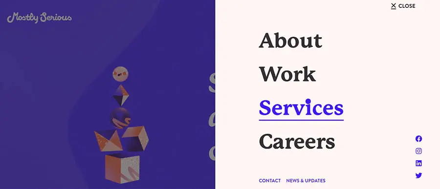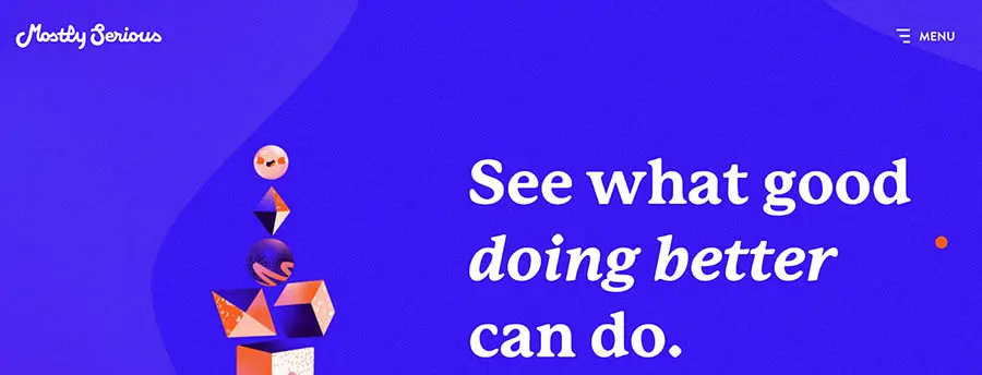 Mostly Serious es una agencia creativa con un sitio web creativamente adecuado. Cuando llegas por primera vez al sitio, notarás un icono de hamburguesa, que deja espacio y pone el foco en la divertida animación en la parte superior de la página: