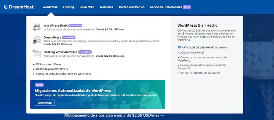 DreamHost ofrece hosting compartido de calidad que puede configurar tu sitio con temas personalizables y complementos imprescindibles para todo tipo de sitios web rápidos, seguros y hermosos. También ofrecemos interfaces fáciles de usar, además de actualizaciones regulares y soporte 24/7.