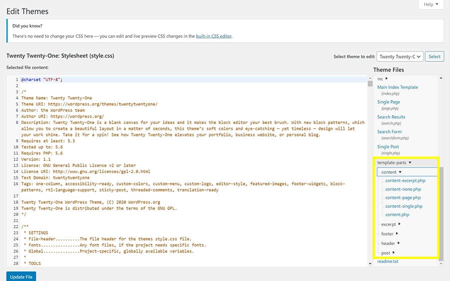 Las plantillas que generan páginas y publicaciones usualmente están bajo la sección content. Encuentra la que necesitas de la lista, revisa y haz las correcciones necesarias. Luego puedes hacer clic en Update File para guardar tus cambios.