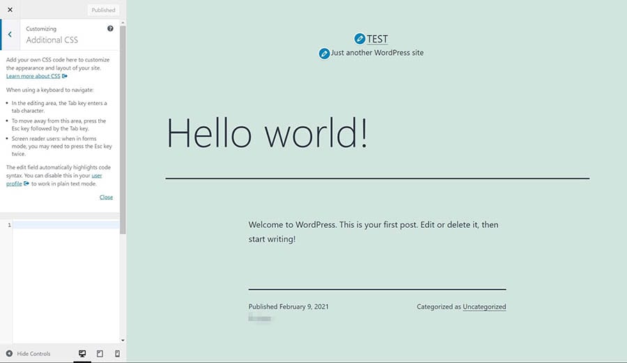 Otra causa frecuente de este error se encuentra en el CSS de tu sitio. La sección Additional CSS del personalizador de WordPress te permite añadir CSS personalizado a tu sitio.