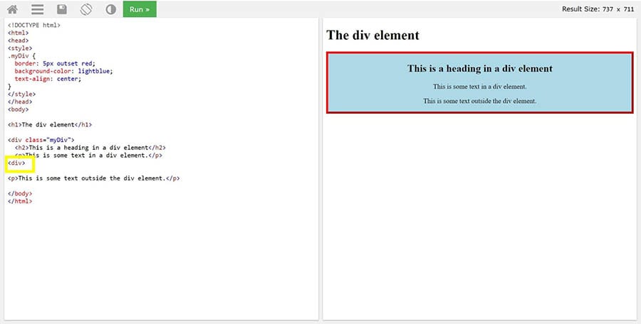 Puedes ver que lo que debería ser la etiqueta de cierre <div> le hace falta una barra diagonal. Como resultado el navegador no sabe que debe estar cerrado y el contenido que debería estar fuera del elemento ahora está adentro.