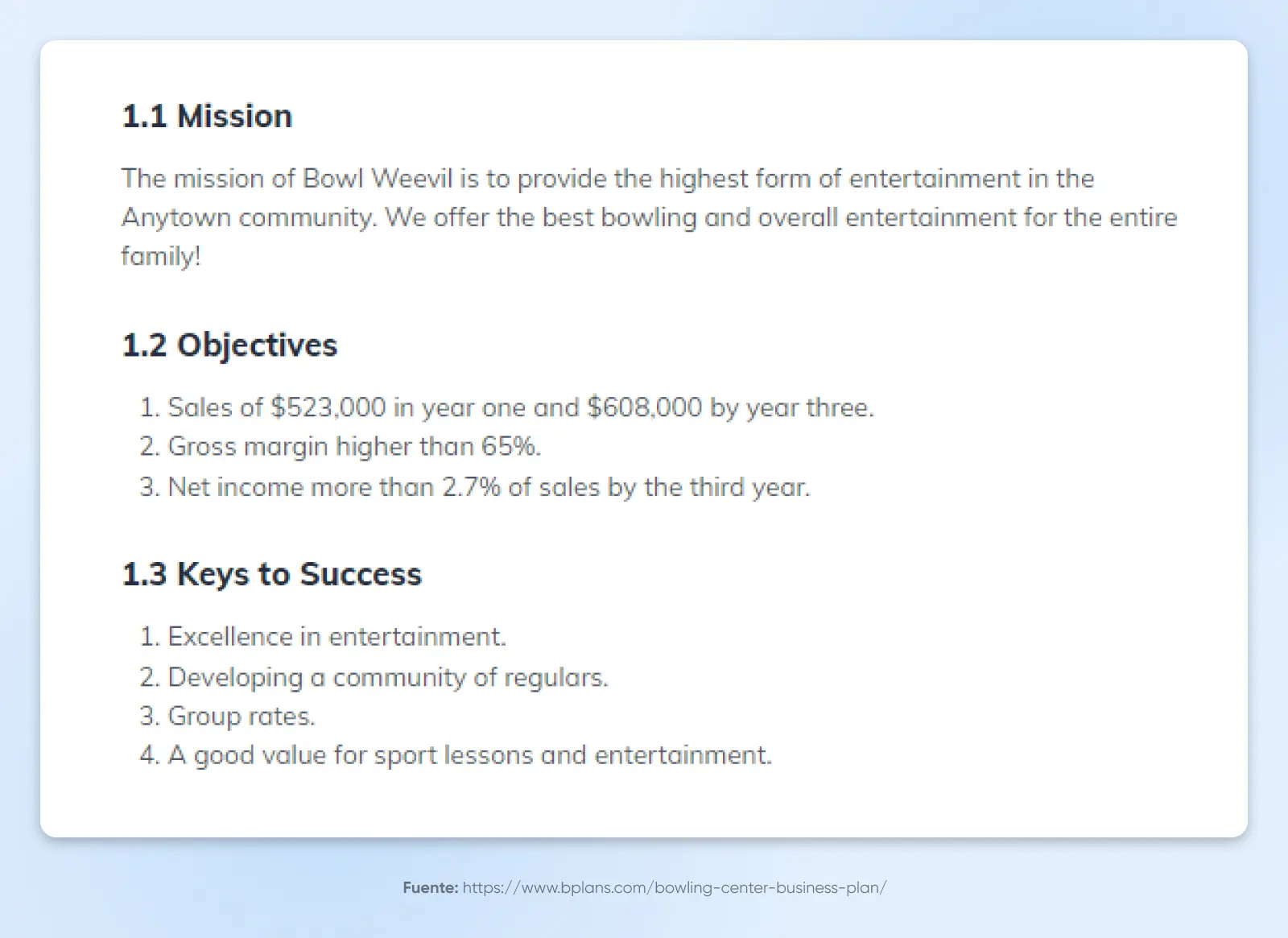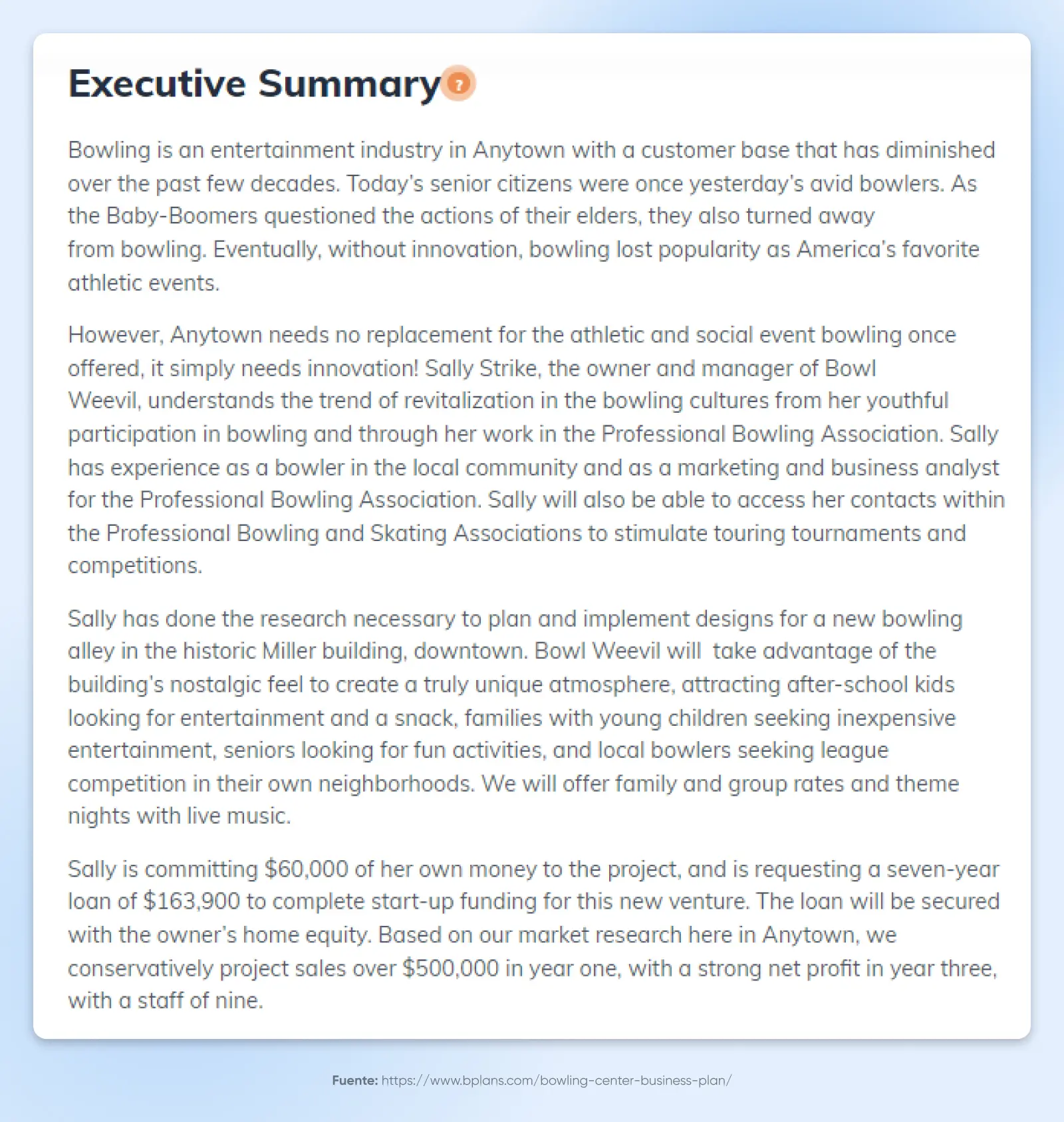 Aquí hay un ejemplo de un resumen ejecutivo para una bolera.