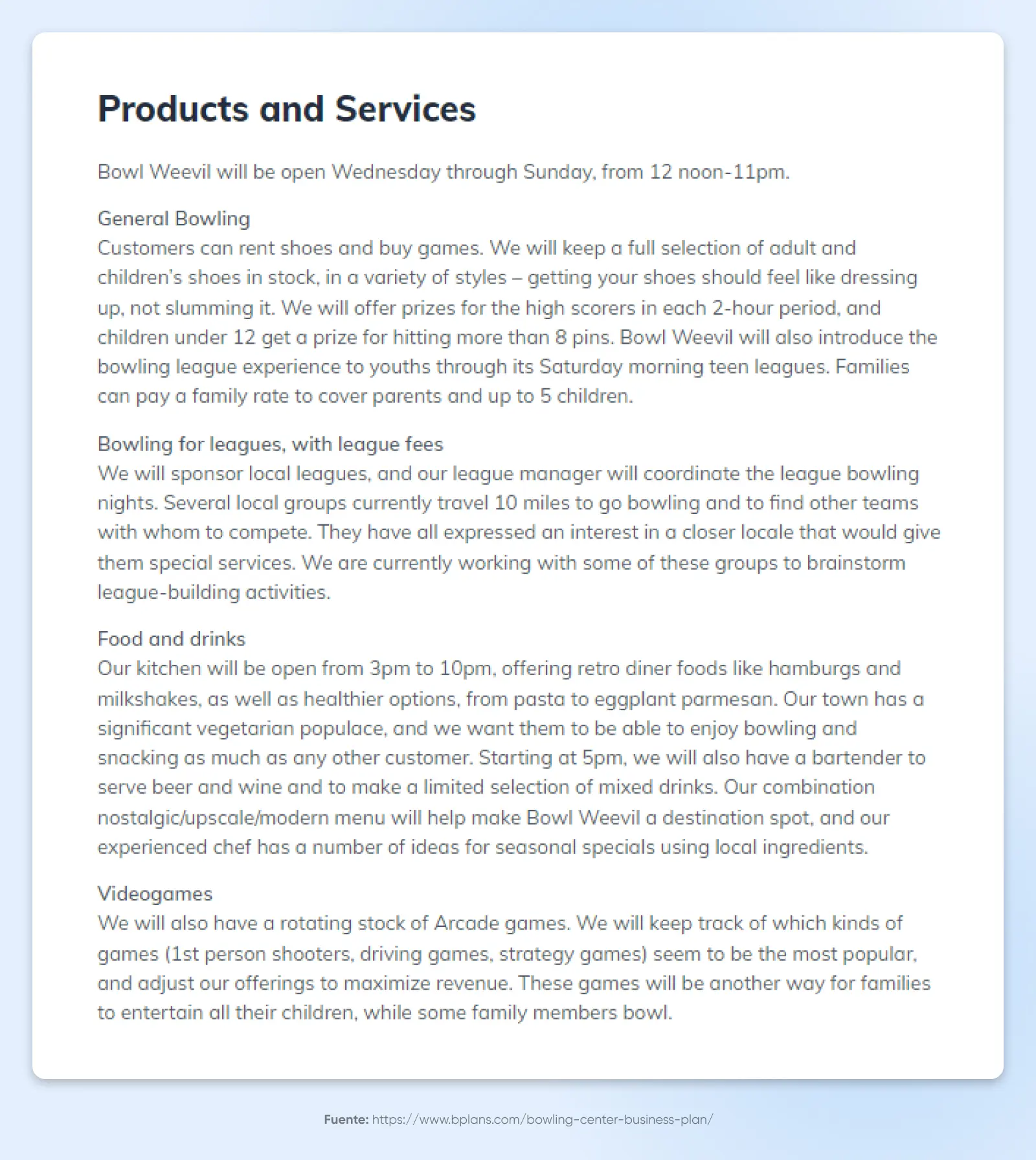 - Productos o servicios: Aunque profundizarás más en esta sección más adelante, proporciona una visión general de tus ofertas principales y cómo satisfacen las necesidades de tu mercado.