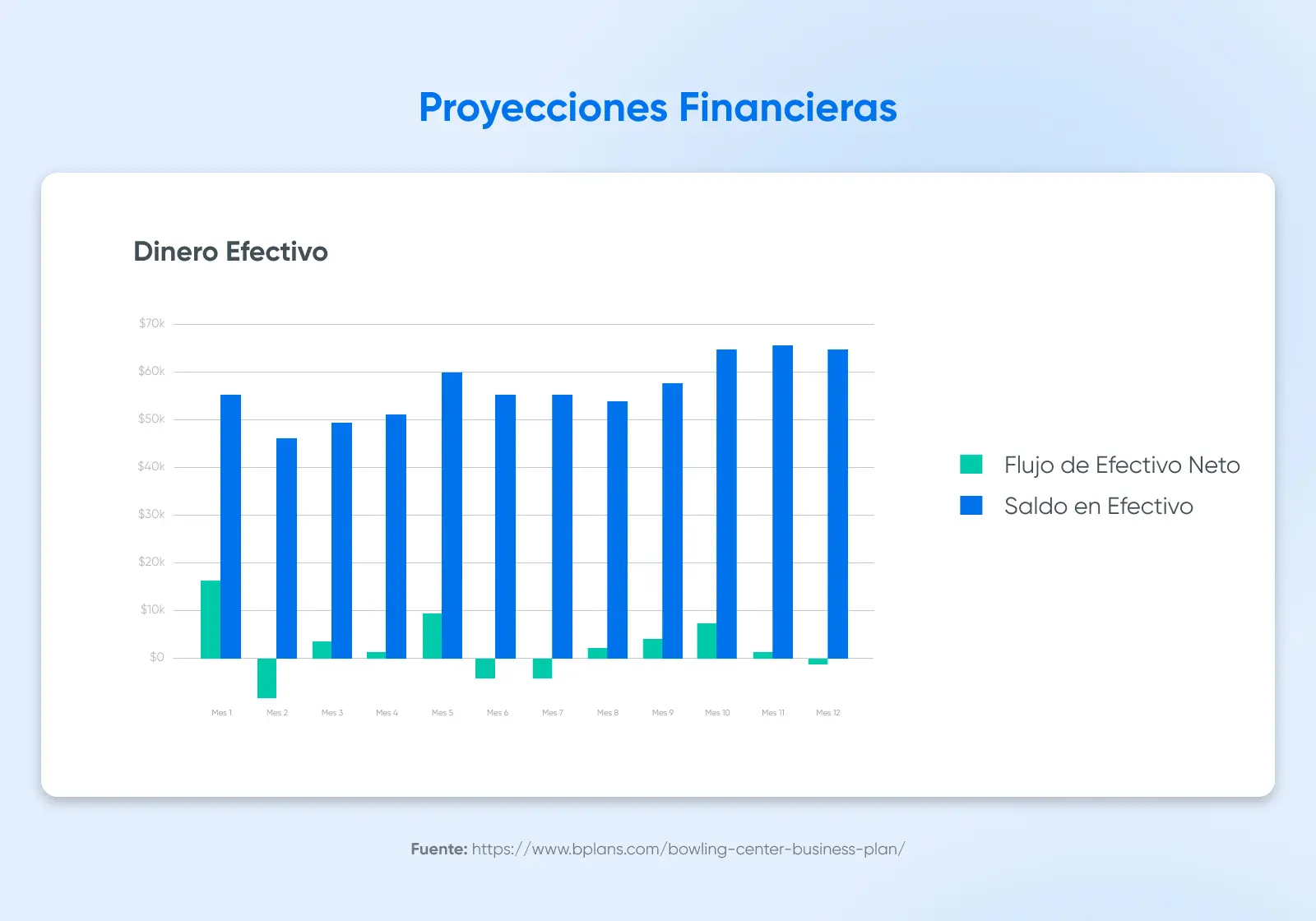 - Estado de flujo de efectivo: Proporciona una proyección de flujo de efectivo mensual o trimestral para el primer año y anualmente después de eso. Esto mostrará cómo se espera que el efectivo entre y salga de tu negocio, destacando períodos de superávit o déficit de efectivo.