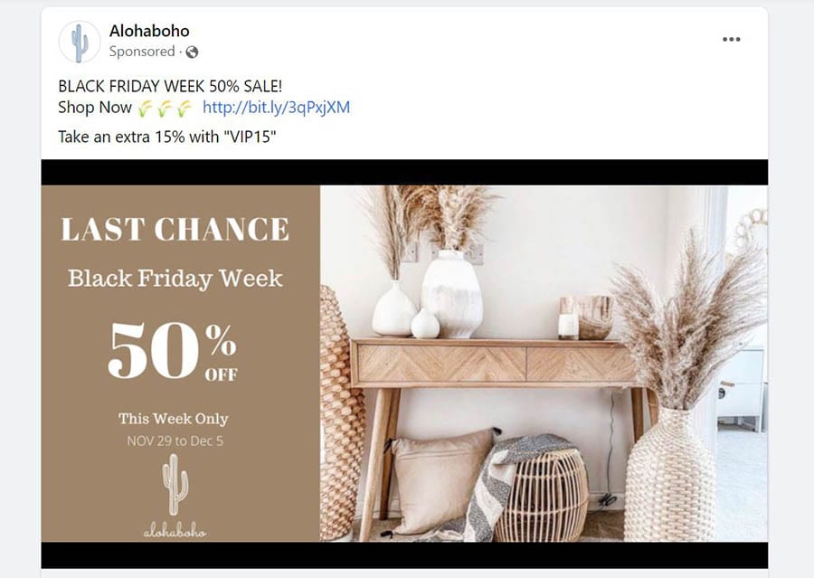 Con los anuncios PPC, pagas una pequeña tarifa cada vez que un usuario hace clic en tu anuncio para ir a tu página de destino. Son bastante comunes en la web. Aquí hay un ejemplo de un posible anuncio PPC en Facebook:
