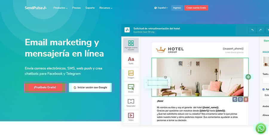 El primer paso al crear una campaña de correo es adquirir una herramienta de marketing. Mailchimp es una buena opción, como lo discutimos anteriormente. SendPulse es otra herramienta poderosa que te da automatización completa de campaña con personalización a nivel individual.