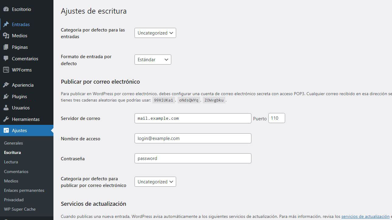 Por el momento, WordPress sigue admitiendo la publicación de artículos por correo electrónico. La siguiente sección te permite configurar esta función. Es muy similar a la configuración de un cliente de correo electrónico; solo tienes que introducir tus datos SMTP.
