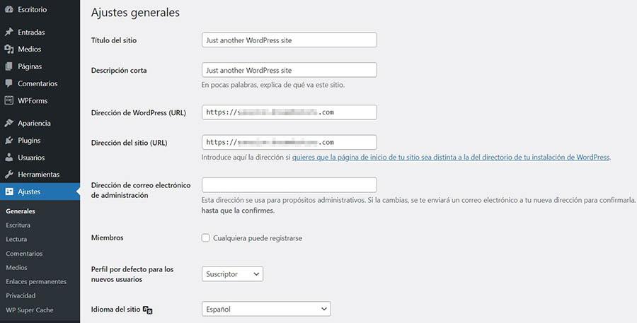 Más abajo, tenemos los campos para la “Dirección de WordPress (URL)” y la “Dirección del sitio (URL)”.