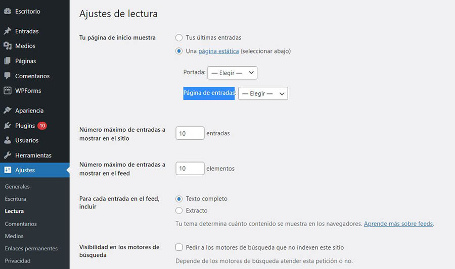 La pantalla “Lectura” se refiere a cómo verán tu sitio los visitantes. Aquí no te bombardean con opciones, pero cada elección marca una gran diferencia.