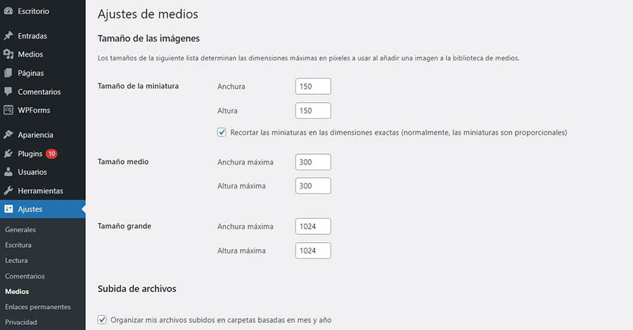 Esta vez solo hay una casilla de verificación. Activa Organizar mis archivos subidos en carpetas por mes y año si deseas mantener tus archivos subidos perfectamente organizados.
