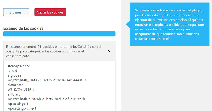 En la siguiente sección, Complianz analizará tu página web para detectar qué cookies se encuentran activas. Desde este menú, podrás configurar las cookies que deseas permitir y cuáles bloquear:
