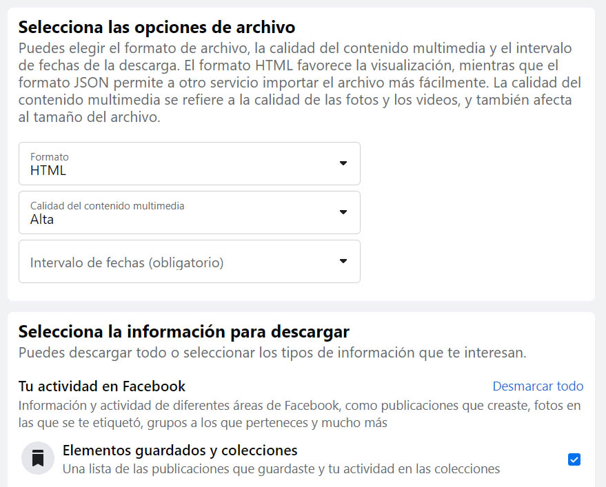 Los formatos que Facebook ofrece no son necesariamente compatibles con otras plataformas, como tampoco lo es toda la información que guardan. Es decir, si intentas importar un archivo HTML o JSON con tu información a otra red social como Pinterest, es posible que no puedan procesar toda la información.