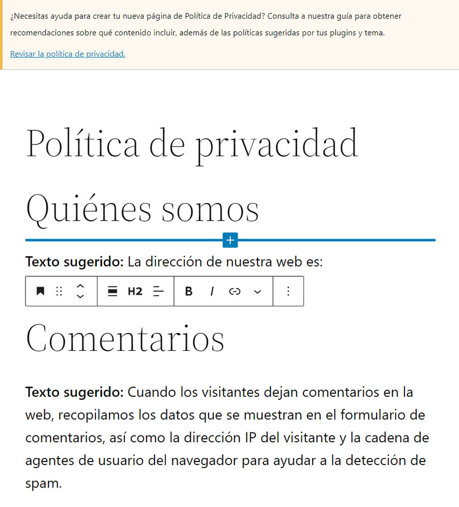 Si haces clic en ‘Crea’, WordPress lanzará el editor y te mostrará un modelo de política de privacidad que puedes editar para ajustar a tus necesidades: