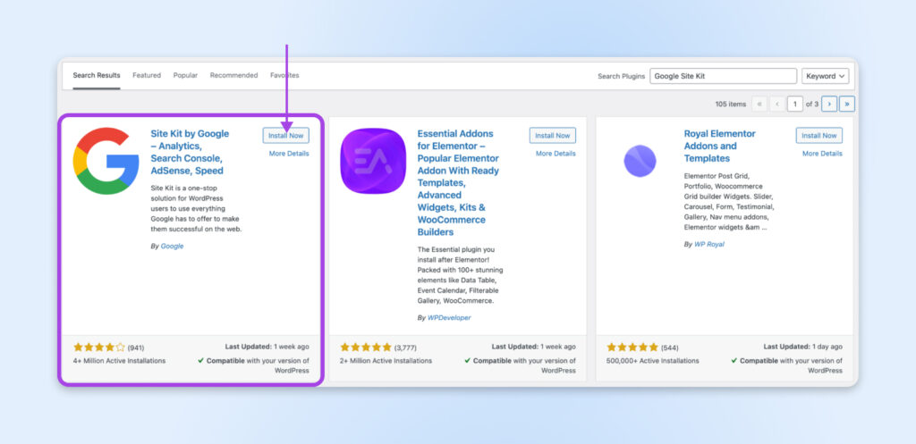 En la barra de búsqueda, escribe “Google Site Kit” y busca el plugin con el logo oficial de Google.