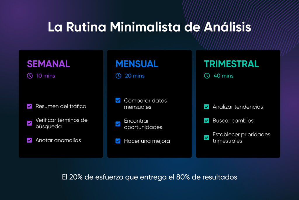 - Programa “Lunes de Análisis” como un bloque recurrente de 15 minutos en tu calendario a las 9 AM