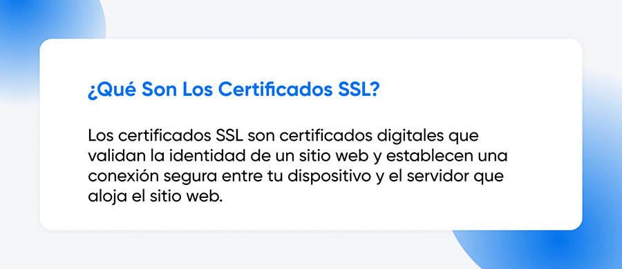 Los certificados SSL son certificados digitales, que validan la identidad de un sitio web y establecen una conexión segura entre tu dispositivo y el servidor que aloja a ese sitio. Esto asegura que la información que envías o recibes en línea estará protegida de hackers.