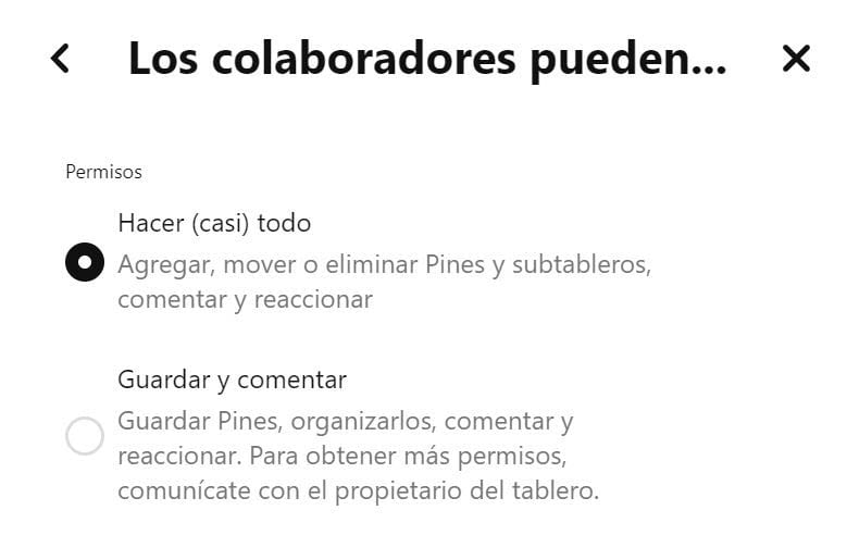 Podrás configurar permisos para tus colaboradores. Elige si pueden cambiar los Pines existentes o simplemente añadir los suyos.