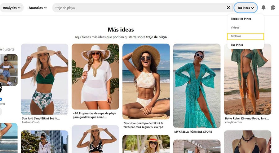 Para encontrar tableros populares de tu nicho, comienza por escribir palabras clave relevantes en la barra de búsqueda. Para reducir tu búsqueda, usa el menú desplegable a la derecha.