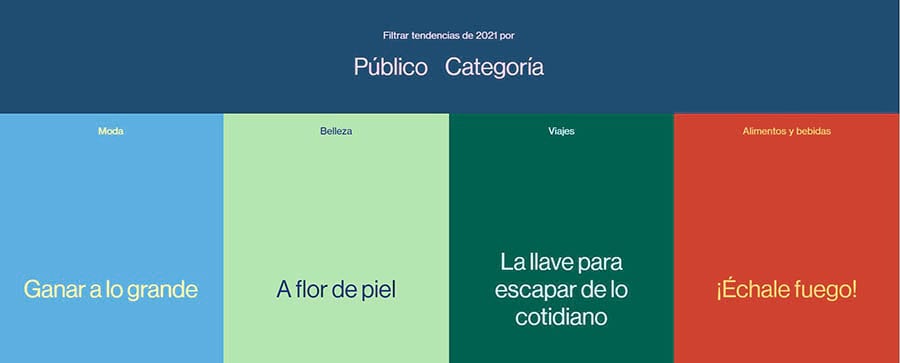 Primero, puede que quieras echar un vistazo a Pinterest Predicts. Este es un reporte altamente visual lleno de consejos sobre qué temas serán tendencia en un futuro cercano en varios nichos.